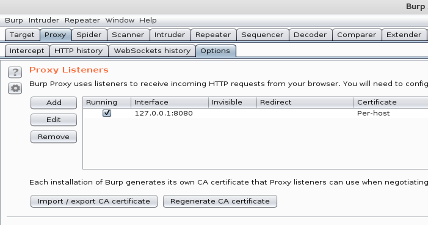 Burp Suite is acting like web proxy server. So, we need to run it and ensure that the proxy is running. Check Proxy => Options => Running flag.