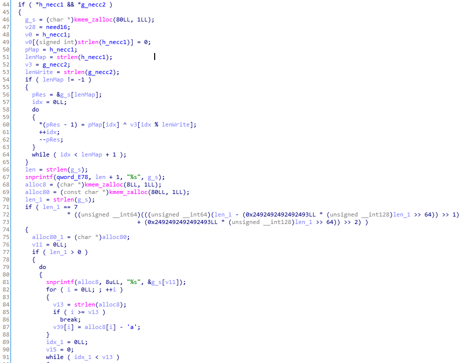 The function check_flag() is really interesting. First of all, it checks two values. That values should be set by mmap() and write() call to the driver device. Later that values will be xored with one another and the result would be actually checked in check_flag().